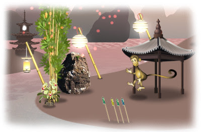 Basically you are this monkey, and you have to play games to earn sand dollars. You start on this island called Outset Island. When you earn enough, you can buy items for food (fruit trees, minibars...), fun (scuba gear, beach balls, fireworks...), and comfort (grass, beach chairs, your own island bungalow...). You can arrange and decorate your island and make it pretty. When you fill up the food, fun and comfort levels for that island, you unlock a new game.